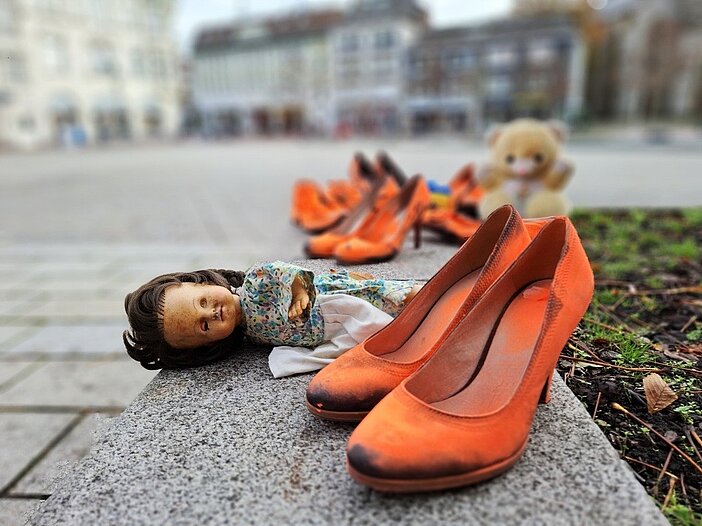 Orangefarben angesprühte Frauenschuhe und derangiertes Spielzeug stehen im Mittelpunkt einer Mahnaktion gegen Gewalt an Frauen und Kinder, die die Gütersloher Soroptimistinnen zusammen mit ihren Netzwerkpartnerinnen am Samstag, 22. November, von 10 bis 14 Uhr in der Fußgängerzone am Berliner Platz veranstalten.