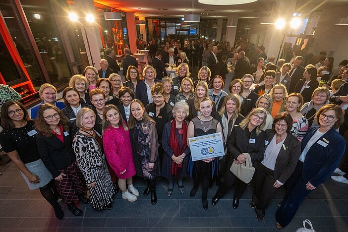 Der Jahresempfang der Handwerkskammer Bielefeld war der passende Rahmen zur Verleihung des ersten SI-Handwerkerinnenpreises, der an die 28-jährige Elektrotechnikmeisterin Alina Garcia (vorn Mitte) ging, die sich freudestrahlend von SI-Deutschland-Präsidentin Manuela Nietzsche (vorn, Vierte v. l.) und den Soroptimistinnen aus OWL feiern ließ. Foto: Thomas Starke