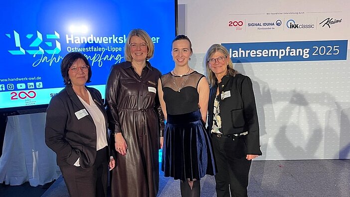 Glückwunsch an die erste Preisträgerin des von den Soroptimistinnen in OWL ausgelobten Handwerkerinnenpreis. Die mit 5000 Euro dotierte Auszeichnung ging an die Elektrotechnikmeisterin Alina Garcia (3. v. links). Die Gütersloher SI-Mitglieder (v. l.) Claudia Holtkamp, Katja Soehnle-Miele und Birgit Troßbach gratulierten.